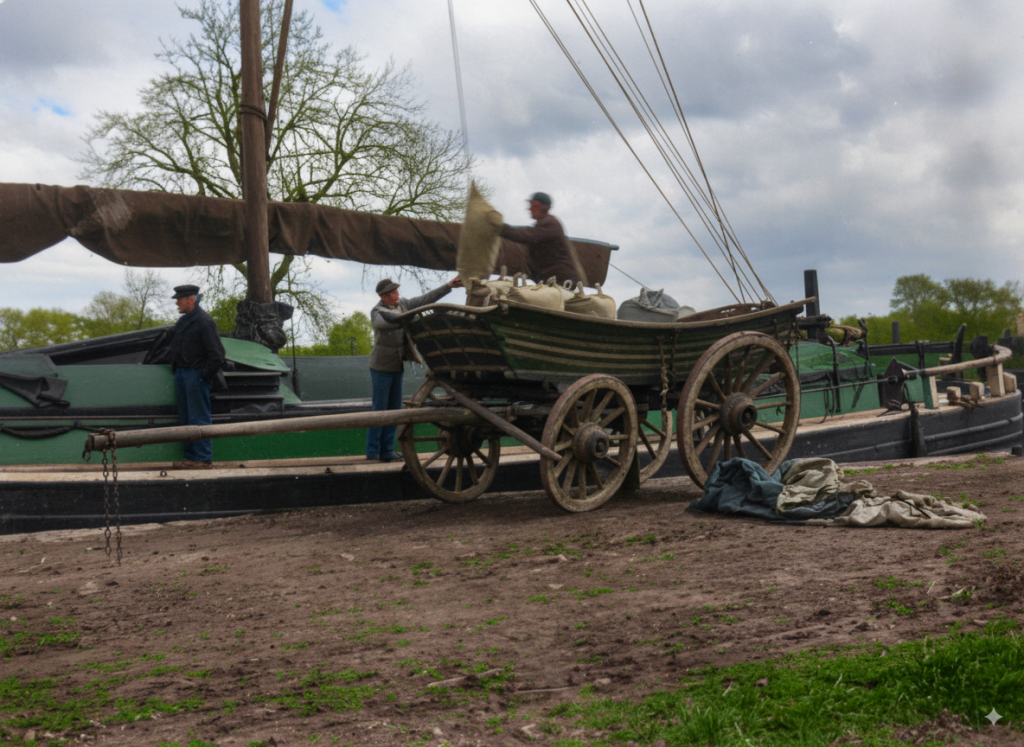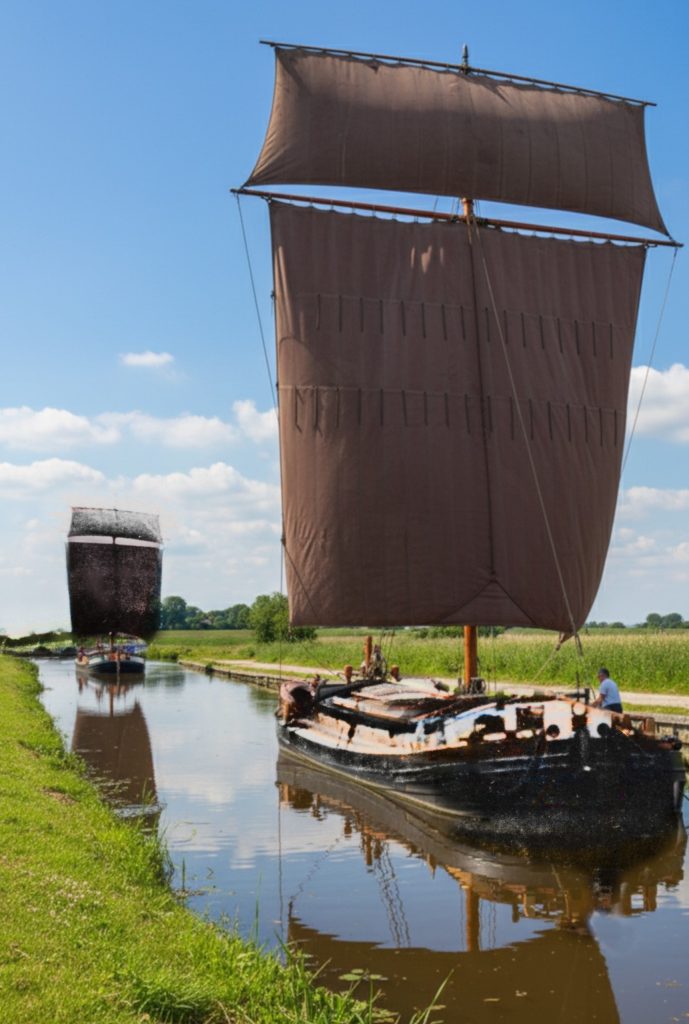 Here a Humber Sloop tows a Humber Keel struggling with the slide wind along the canal.