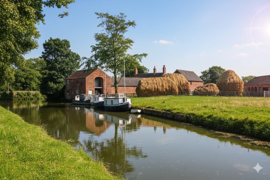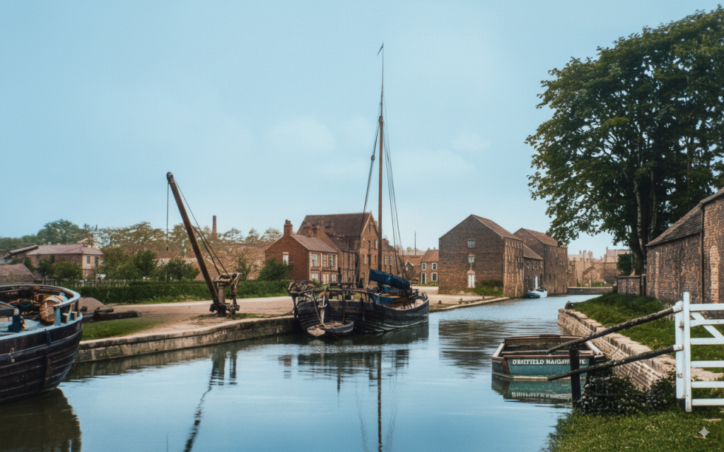 Mortimers Warehouses at the end of the basin, and two keel waiting on the wharf, one near the crane. There is a Driffield Navigation work flat moored on the right side, and in the distance can be seen a steam launch.